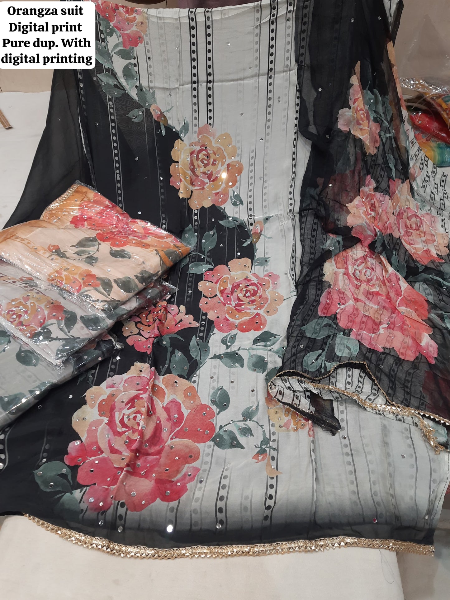 Fantastic flower print white black organza ladies women's unstitched Salwar suits dress material (free size)