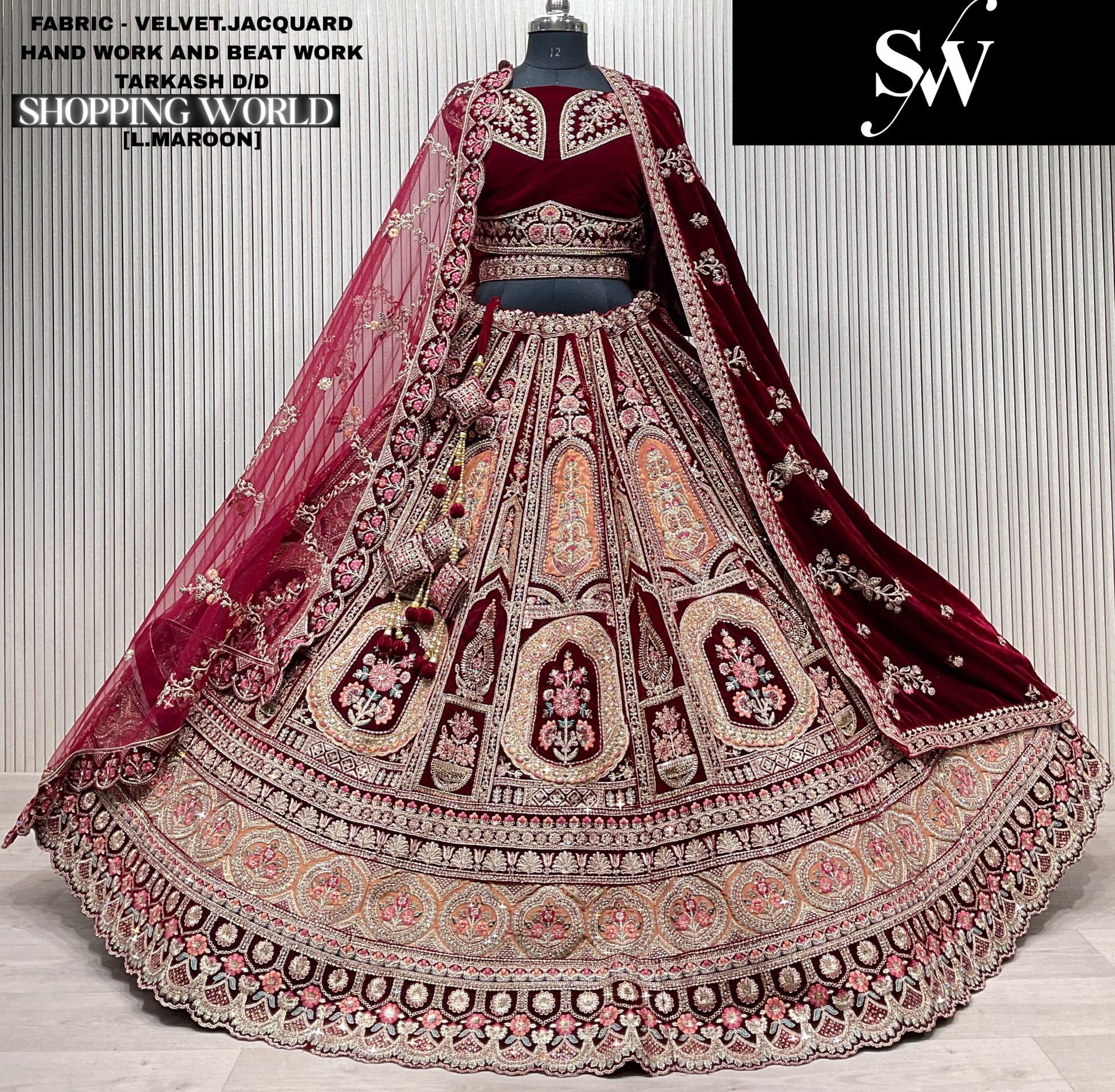 Glamorous Dark maroon Double Duptta Velvet Jacquard Bridal Lehenga