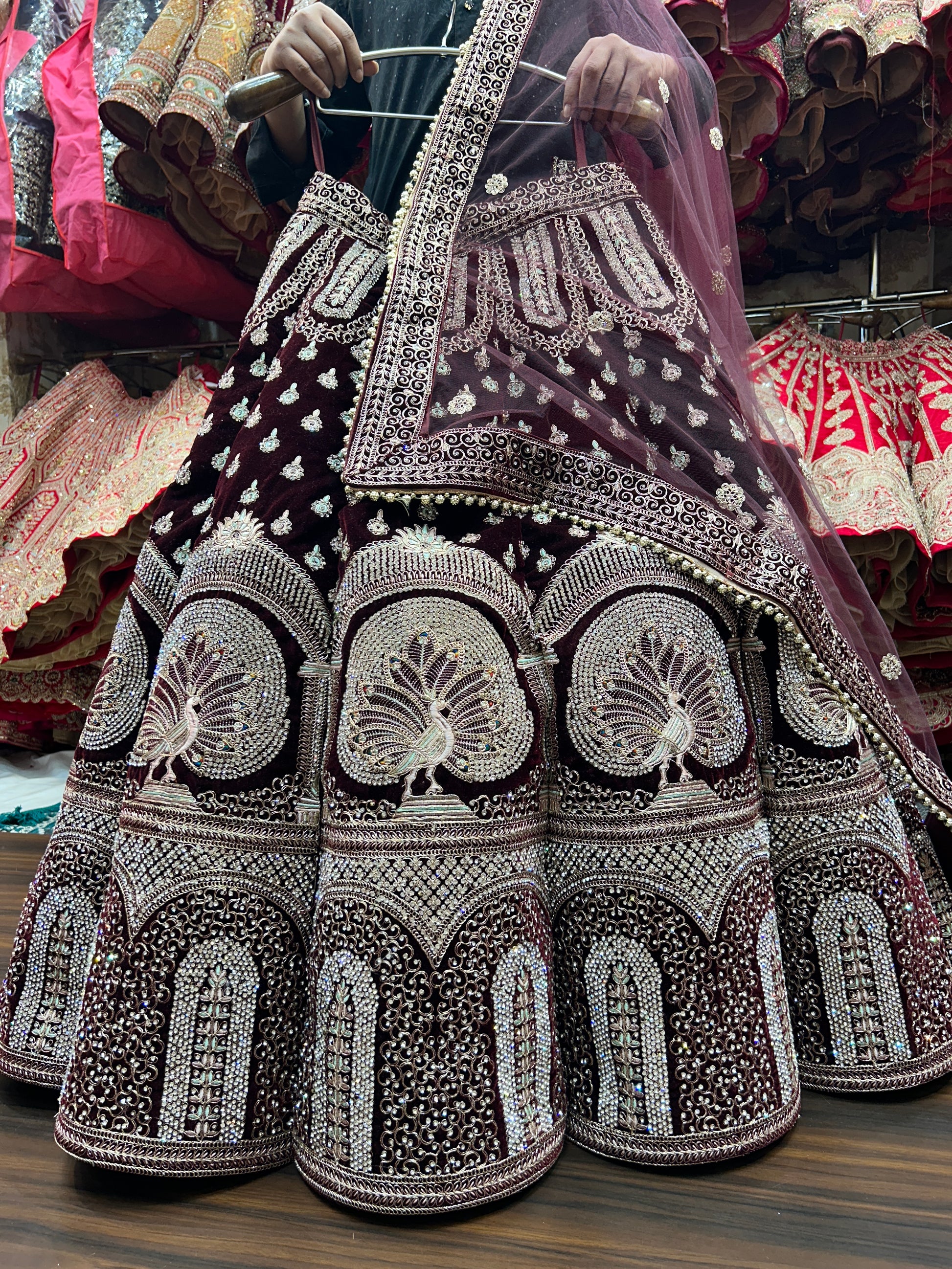 Heavy maroon peacock ball bridal lehenga