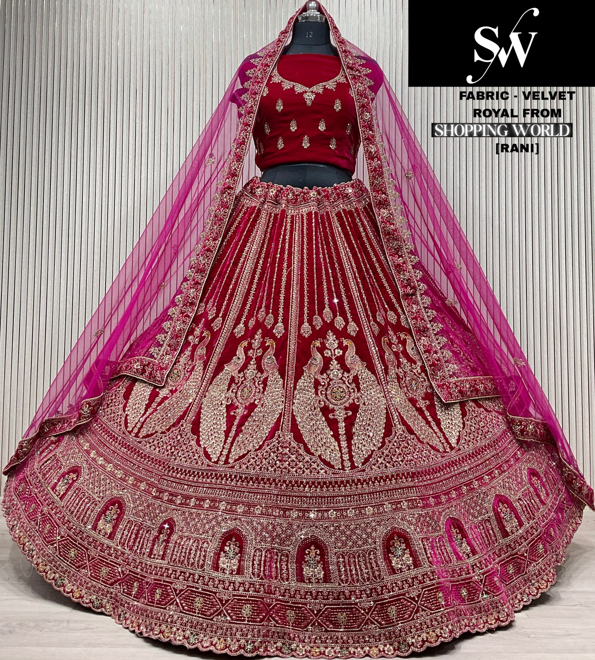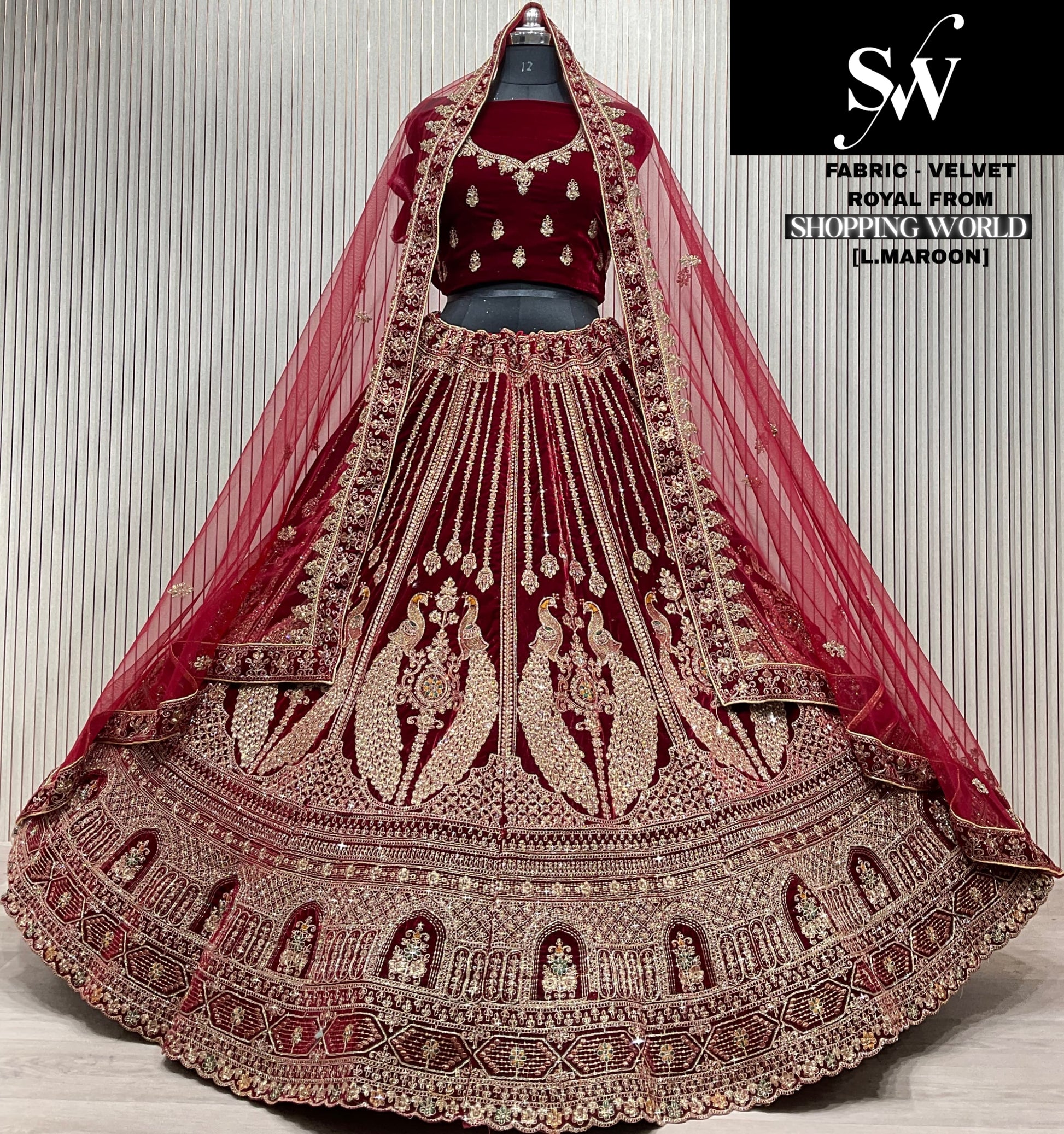 Lovely light maroon peacock Velvet Bridal Lehenga