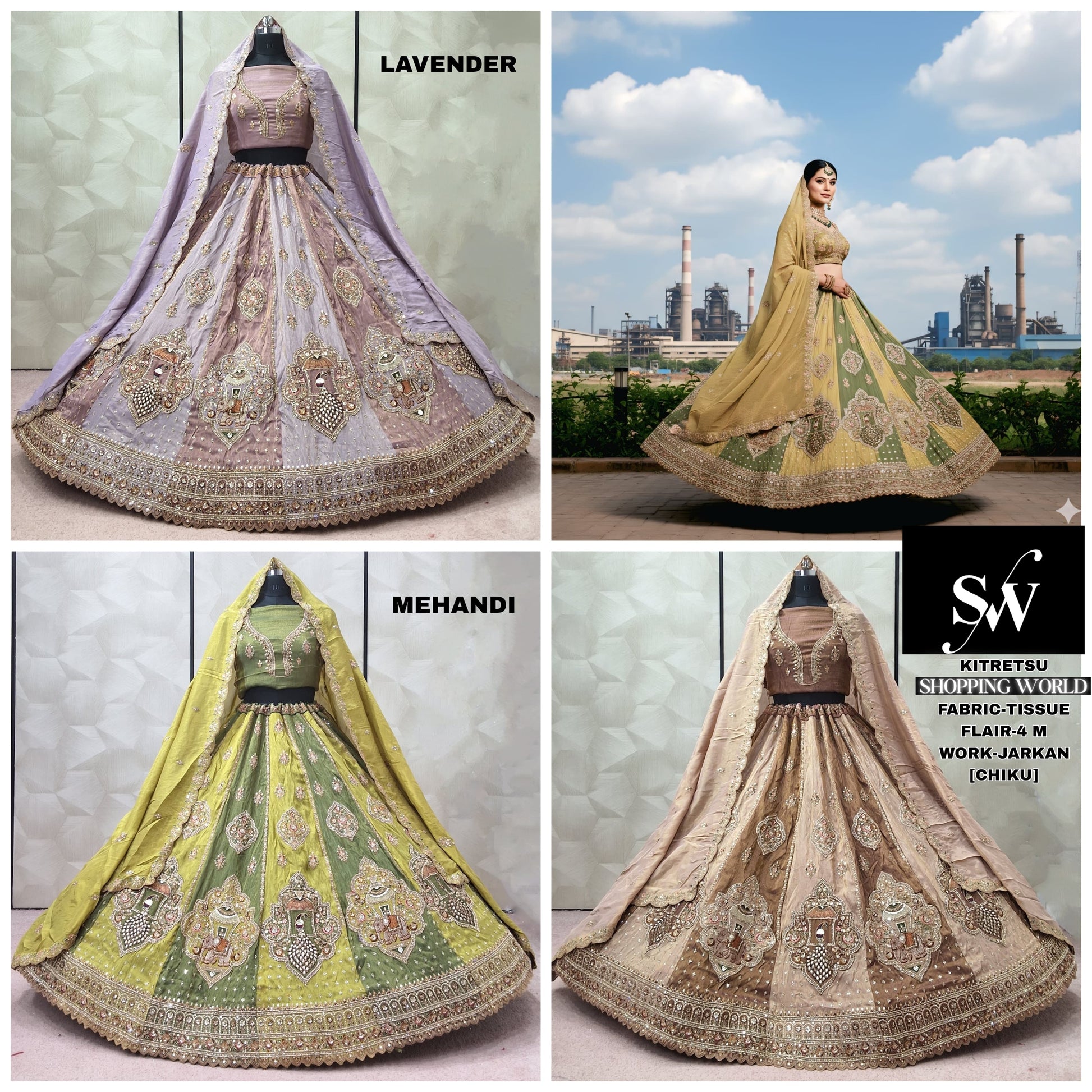 Majestic Lavender Mehendi green Chiku golden Tissue Lehenga