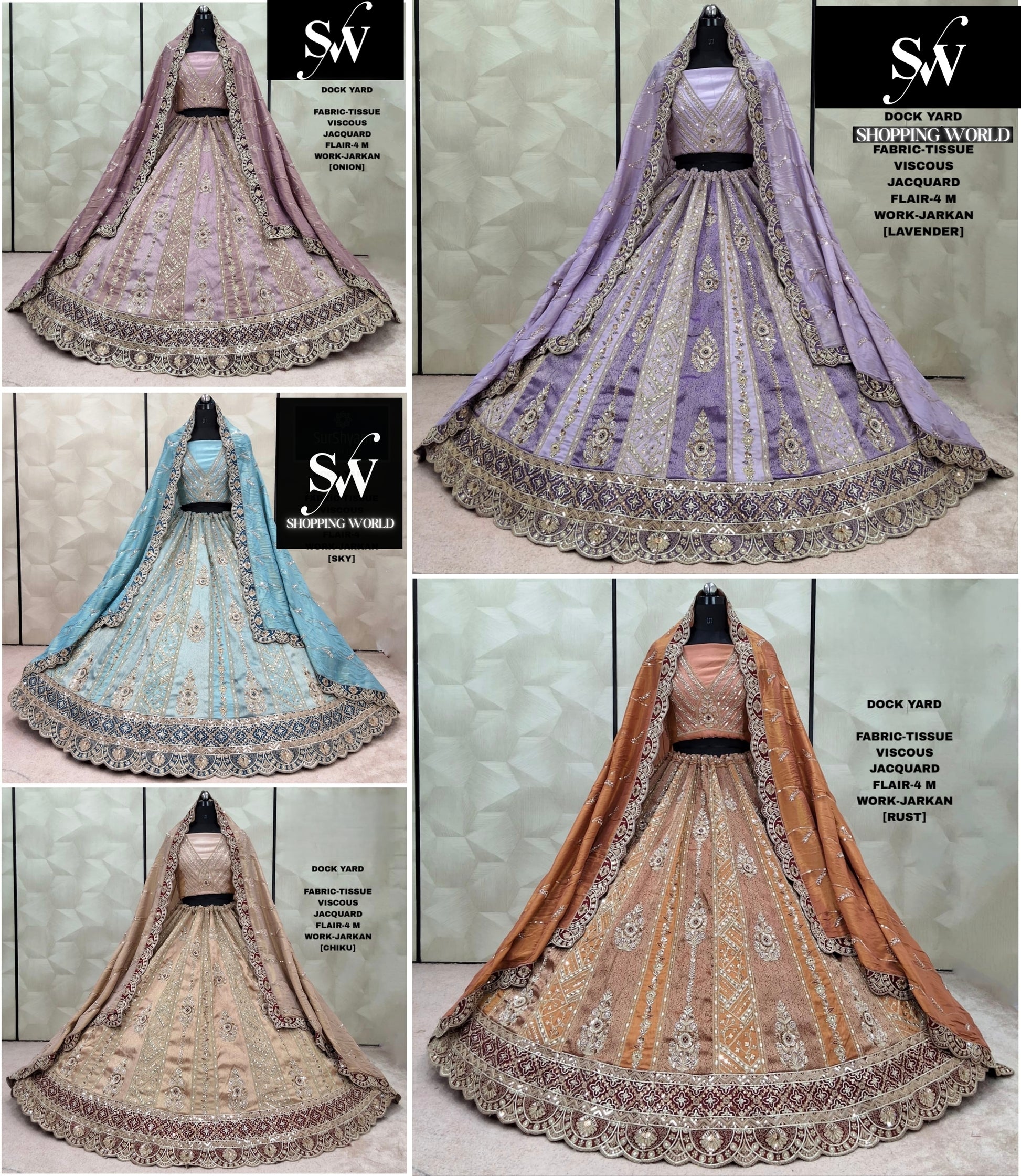 Majestic Sky blue Onion pink Lavender Chiku golden Rust orange Tissue Viscos Jacquard Lehenga