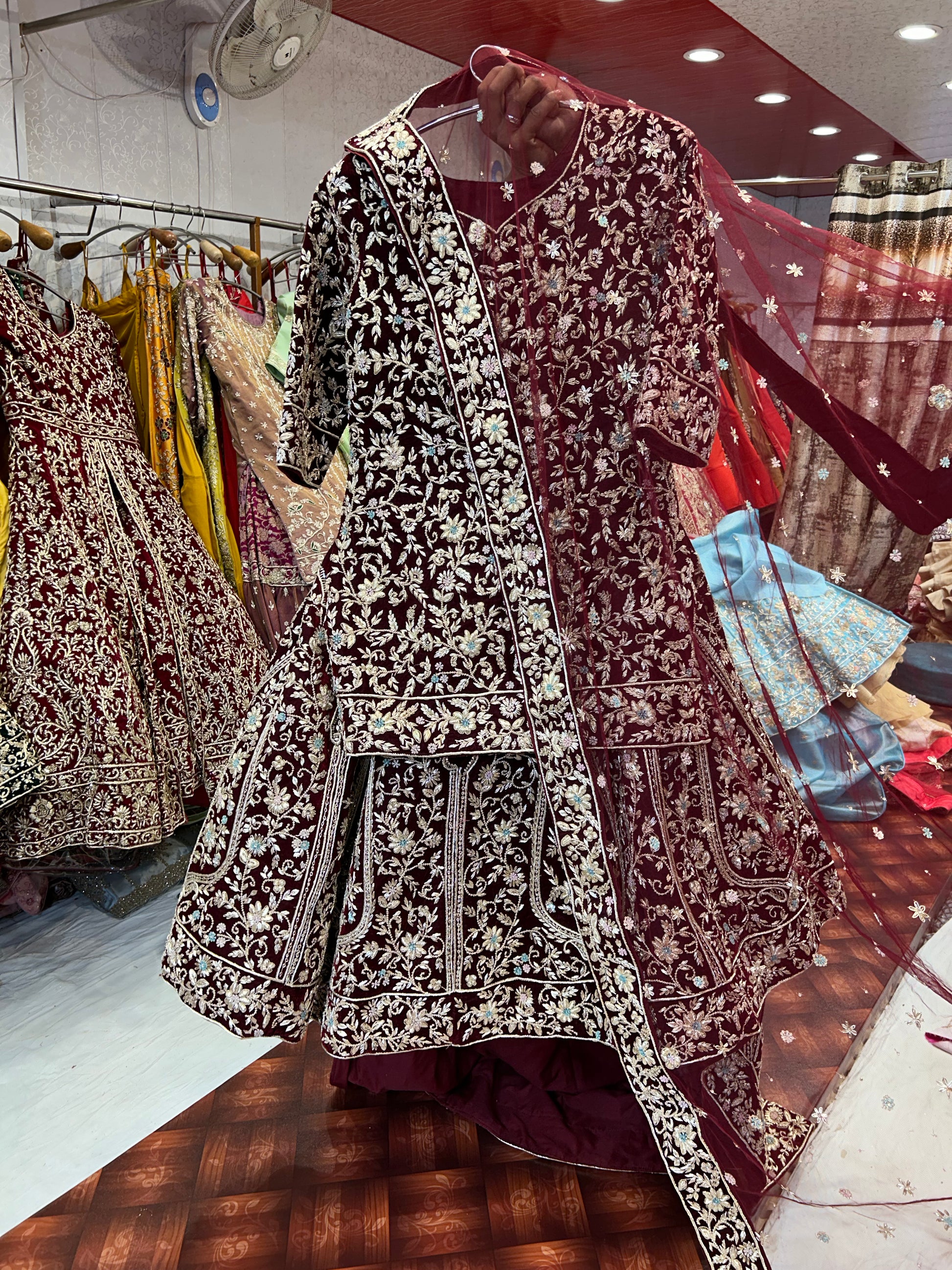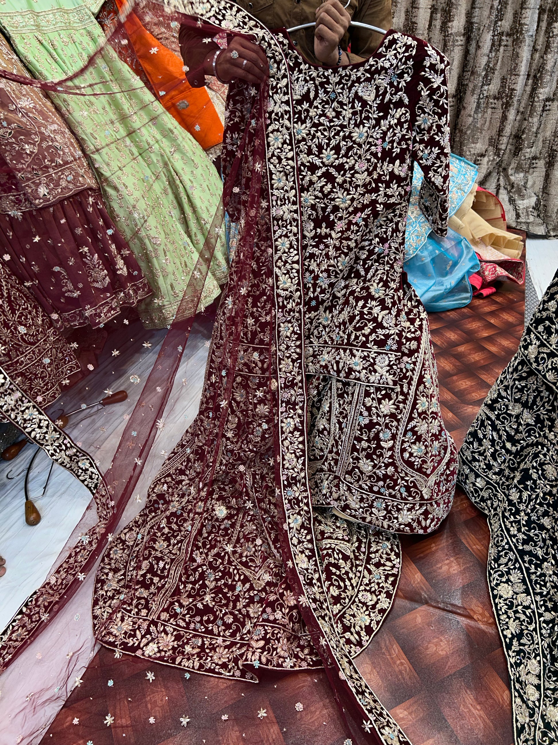 Maroon fabulous Peplum long Dress Farshi Gaharara Pakistani Bridal Dress Muslim Special