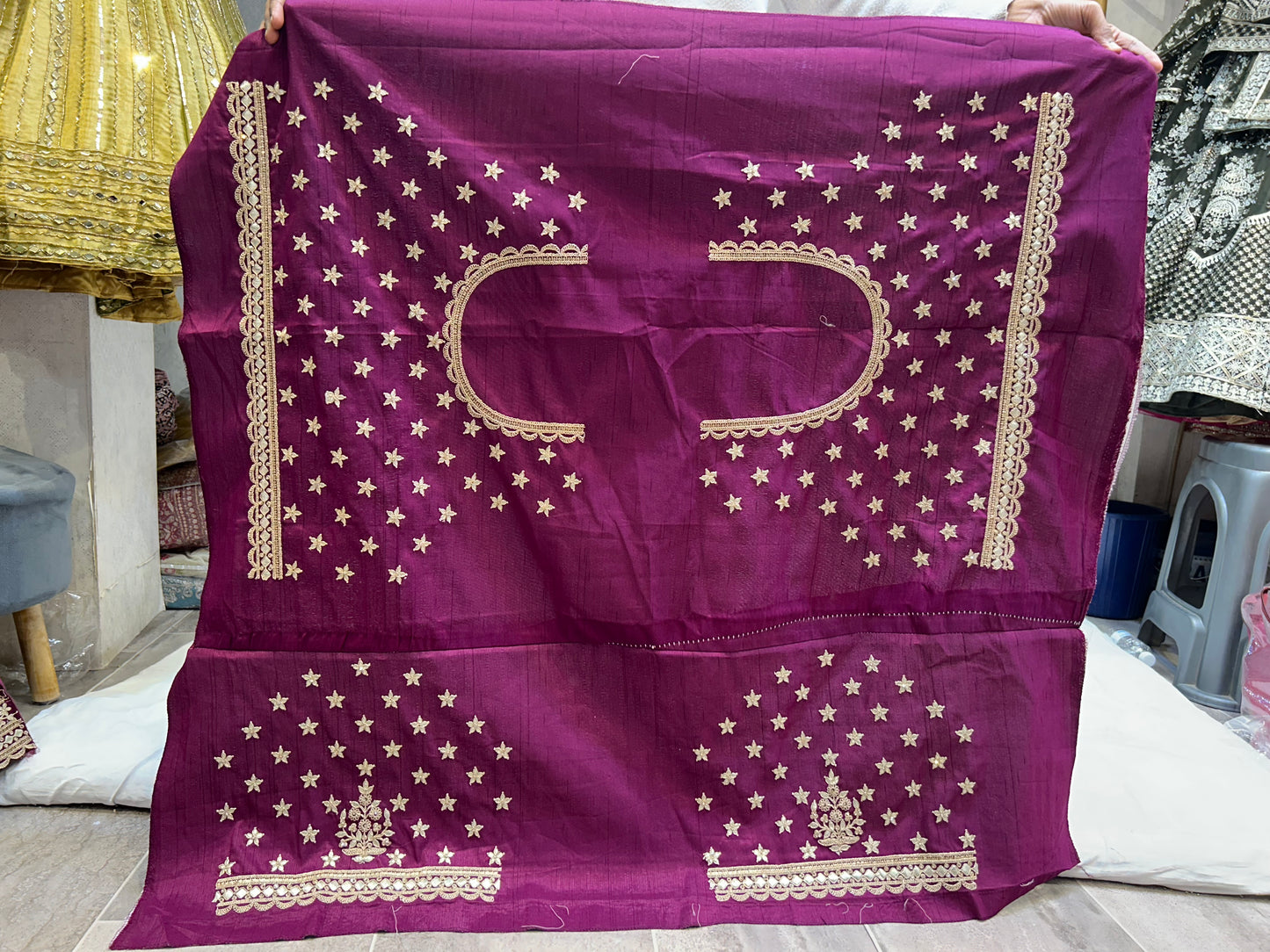 Use our custom stitching service. Submit your measurements and our skilled team will tailor the outfit to your perfect fit.