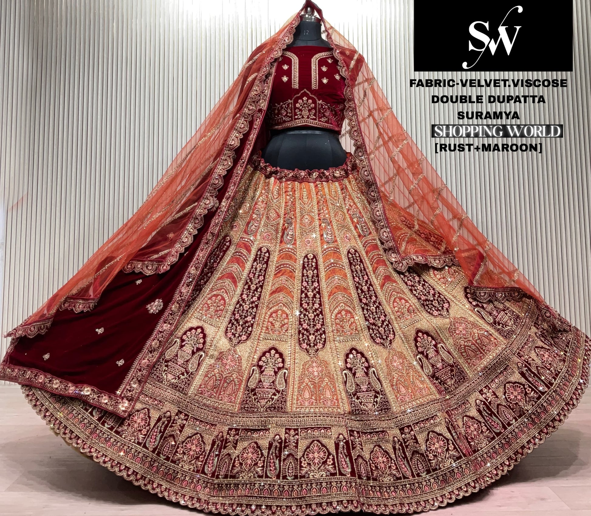 Rust Maroon Double Dupatta Velvet Viscose Bridal Lehenga