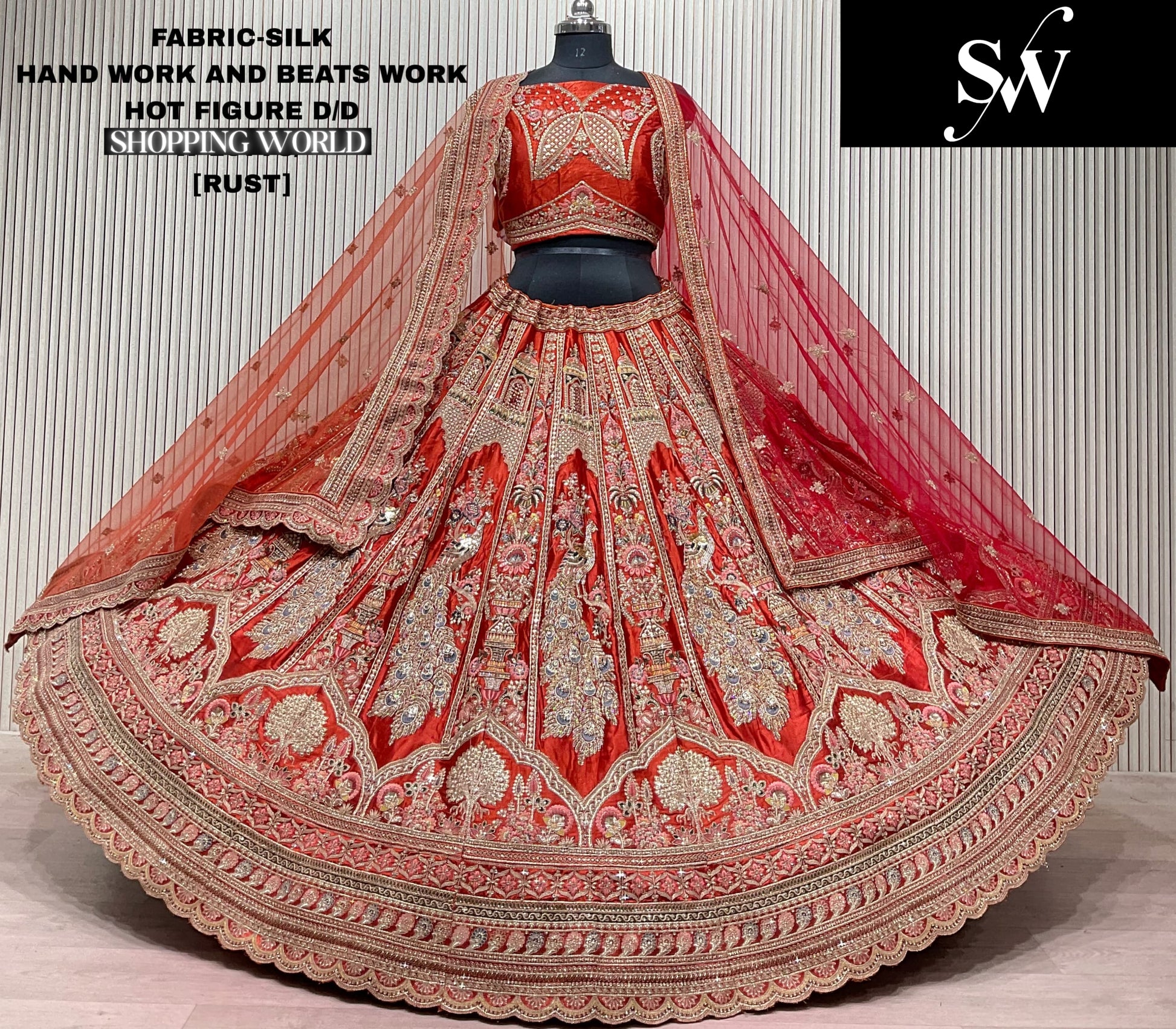 Rust Orange Peacock Silk Bridal lehenga