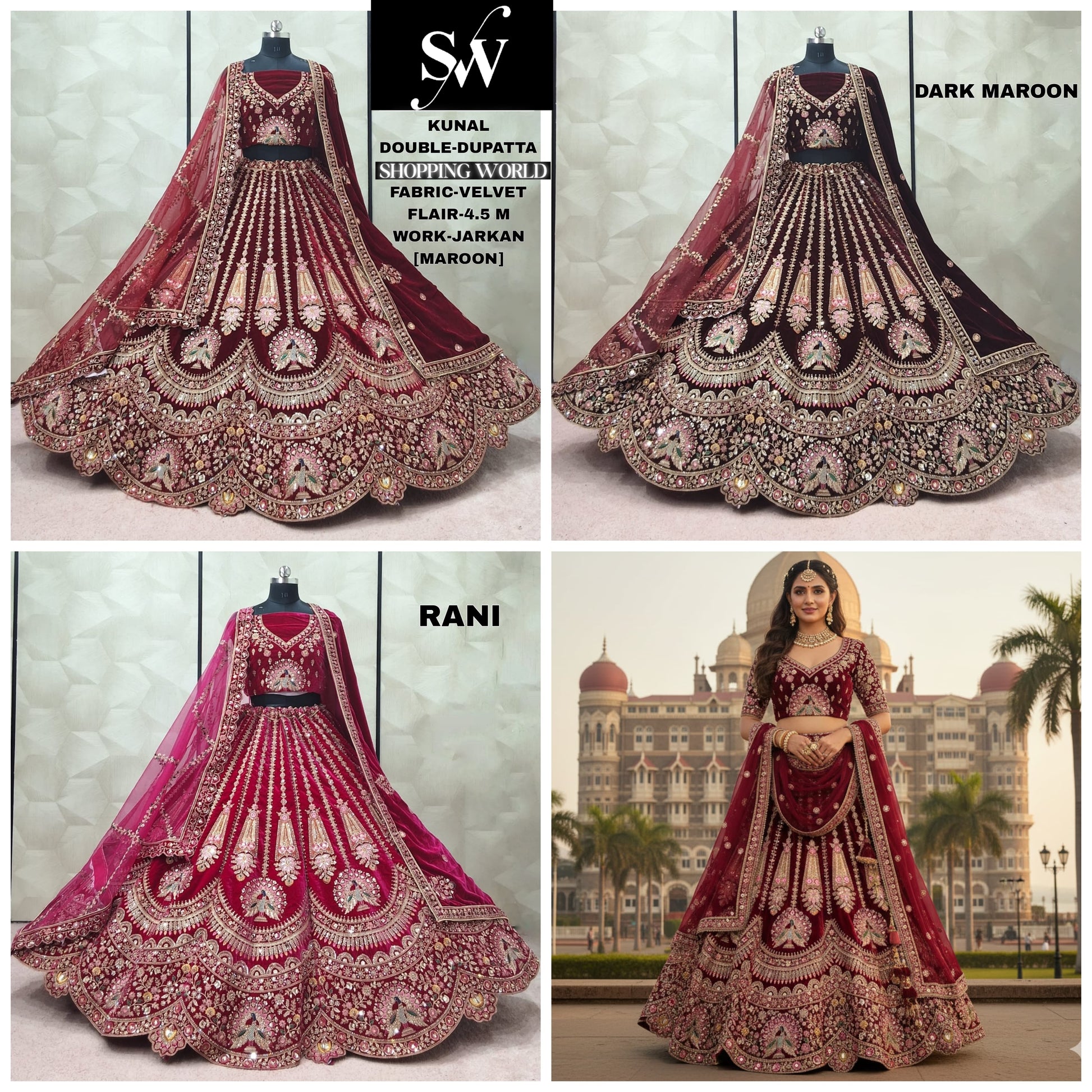 Something different Maroon Dark Maroon Rani pink peacock Velvet Bridal Lehenga