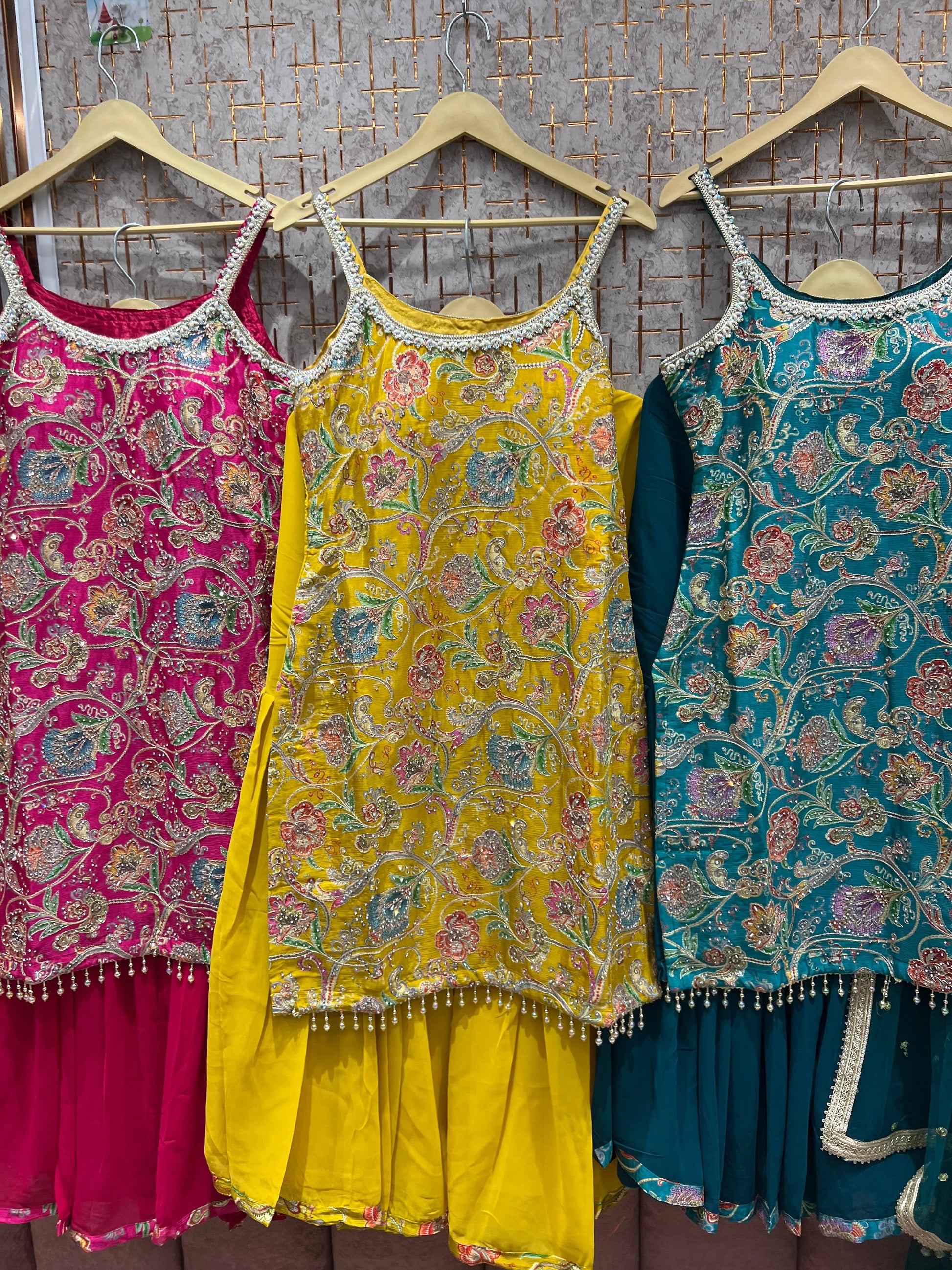 ✨ Weddings & Festive Wear: Sharara suits for weddings, Anarkali suits for weddings, and heavy embroidered suits.