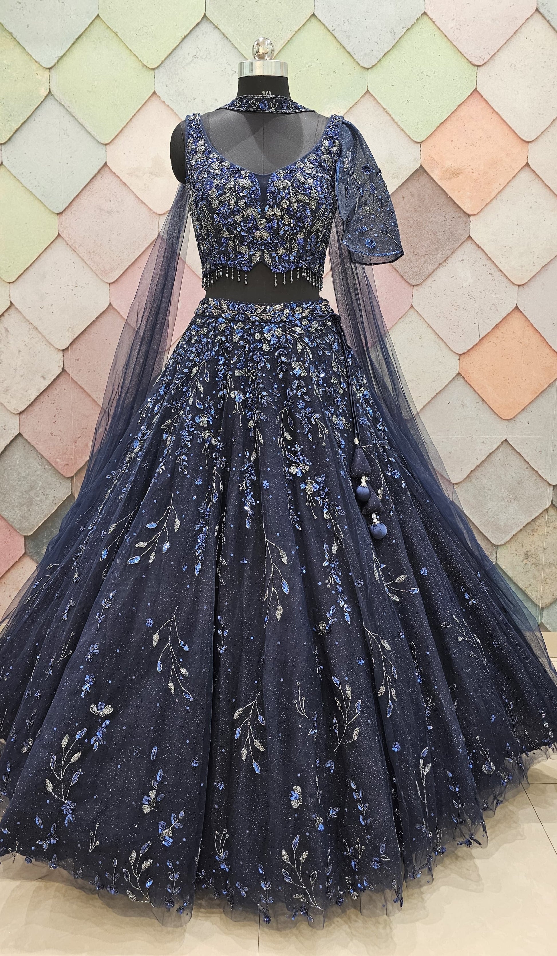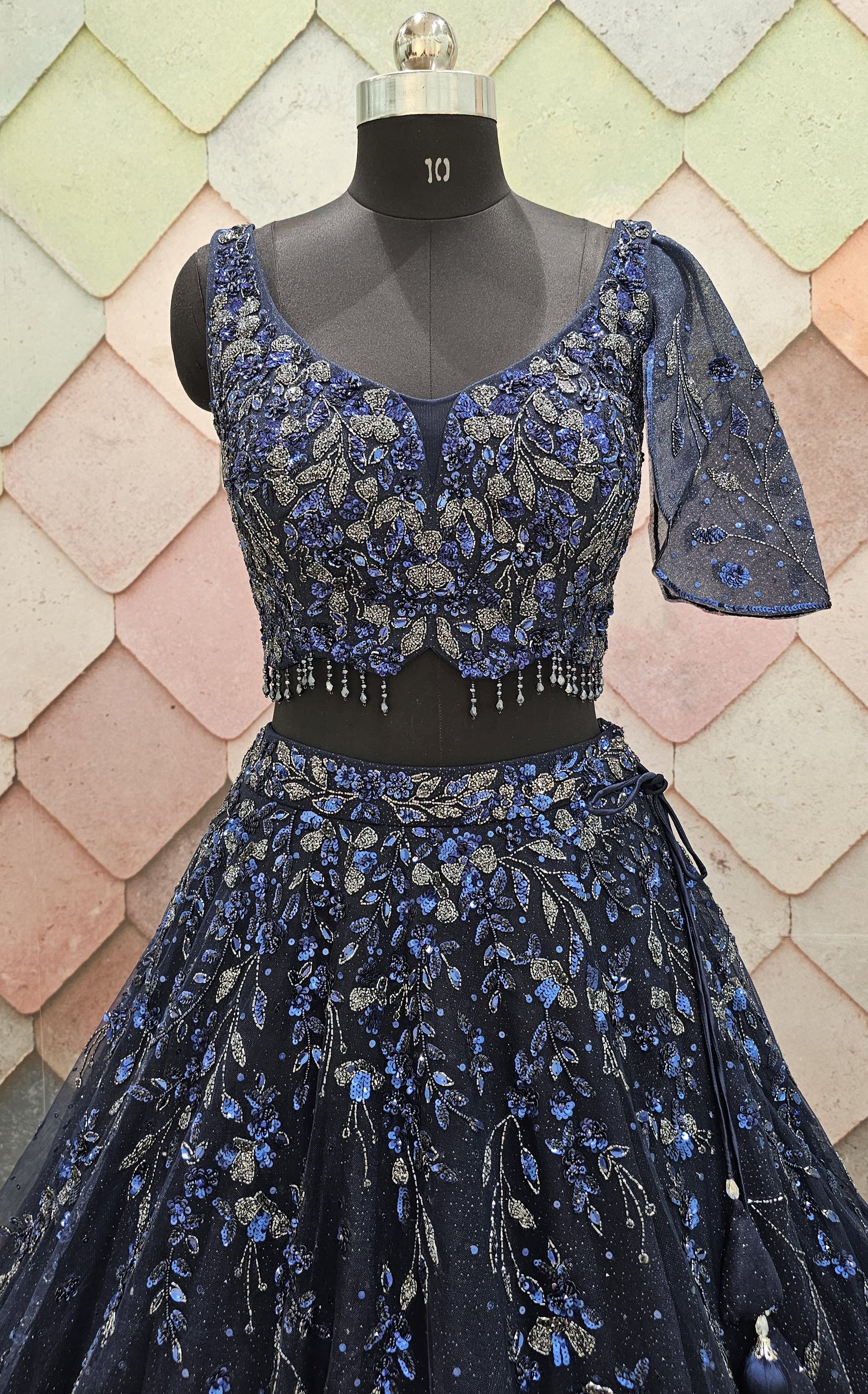 EXQUISITE HANDWORK stunning lehnga choli crafted on net Dark blue Ready to Wear crop top Lehenga